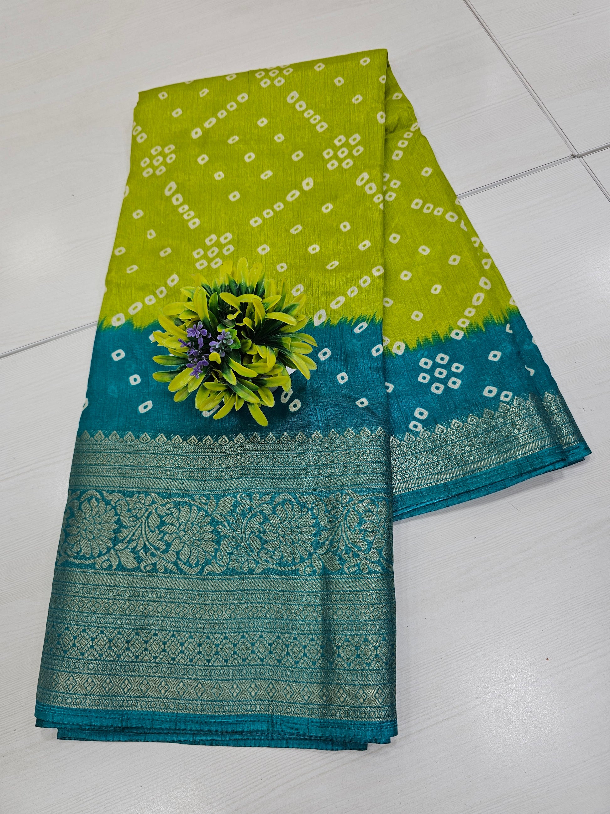 Fancy Bandhini saree in a refreshing green and teal combination, featuring traditional Bandhini motifs across the body and a richly woven floral border. Lightweight with a graceful drape, this saree blends comfort and elegance—perfect for office wear, festive occasions, and everyday sophistication