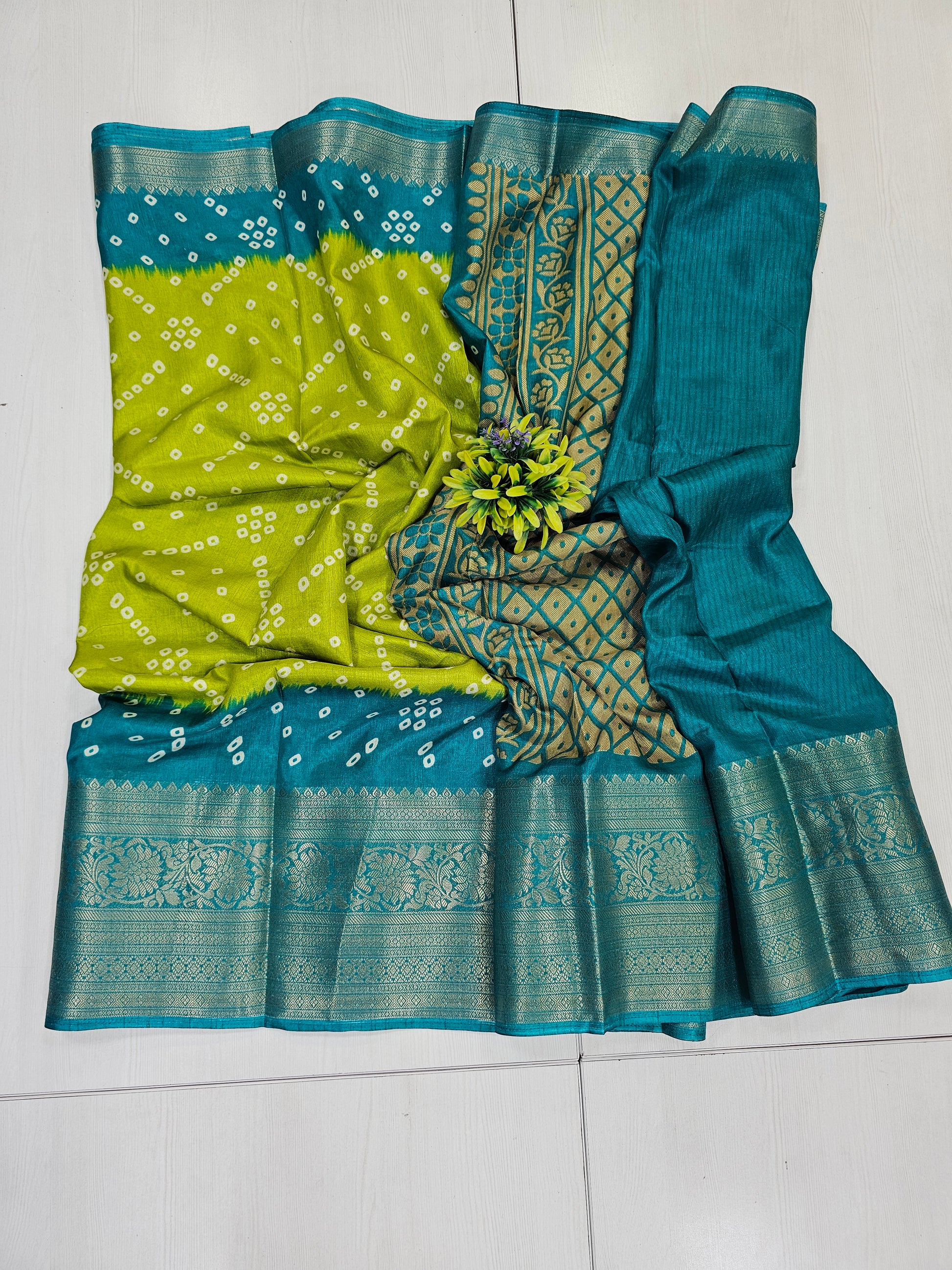 Green & Teal Fancy Bandhini Saree with Woven Border